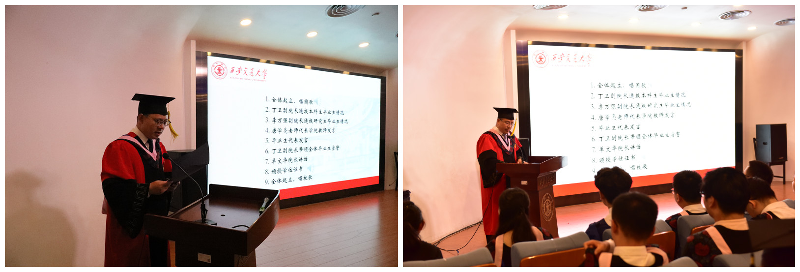 毕业典礼在庄严的国歌中开始。首先,丁卫副院长和李万强副院长分别通报了2021届本科生和研究生的就业情况。博鱼集团官网(中国)官方网站2021届本科生到国内外一流高校深造的比例较往年大幅增长,研究生中有20余名研究生选择留在西部地区到祖国最需要的地方建功立业,另有5名研究生录取为选调生,前往基层、奉献社会、服务人民,用青春书写华彩篇章。