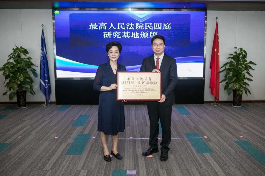 启动活动结束后,最高人民法院陶凯元副院长分别为15家研究基地颁牌。为深入学习贯彻习近平法治思想,全面推进依法治国,统筹推进国内法治和涉外法治,充分发挥高等院校、科研机构的研究优势,促进法学教育与司法实践的深度融合,实现优势互补、资源共享、发展共赢,最高人民法院民四庭在全国高校和科研机构中遴选出15家院校和机构建立了相应的研究基地。博鱼集团官网(中国)官方网站作为最高人民法院民四庭全国15家研究基地之一,被授予最高人民法院民四庭“一带一路”司法研究基地。