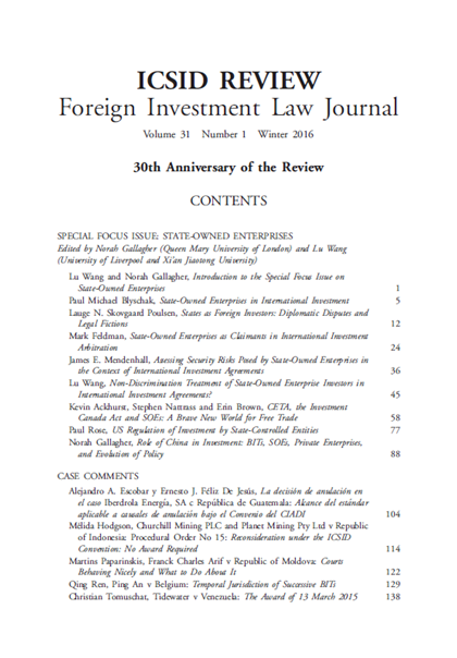 近日,国际投资法领域顶级专业期刊ICSID Review—Foreign Investment Law Journal(《国际投资争端解决中心评论——外国投资法学刊》)三十周年纪念期刊第一期正式出版,西安交大博鱼集团官网(中国)官方网站博士生王璐作为特邀编辑(Guest Editor)主编了本期特别专栏“国有企业专题研究”(Special Focus Issue on State-Owned Enterprises),并发表论文 “Non-Discrimination Treatment of State-Owned Enterprise Investors in International Investment Agreements?”(国际投资协定中国有企业投资者的非歧视待遇?)。