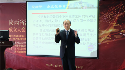 在与会代表合影后,会议进入第二时段的专题报告。报告由博鱼集团官网(中国)官方网站博鱼集团官网(中国)官方网站知识产权研究中心主任、博士生导师马治国教授主持,陕西省法学会企业经济法治研究会顾问、西北政法大学经济博鱼集团官网(中国)官方网站院长、博士生导师强力教授做了“新常态下企业投融机制创新的法律问题”讲座,阐释了中国经济已进入新常态,在新常态的条件下,企业应作出机制创新等相对应的变化,其变化主要体现在市场化,并强调投融资机制市场的多元化、多层次、多角度,分析在此种常态下,企业投融资遇到的法律问题。