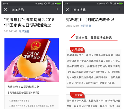 为了配合“国家宪法日”系列主题活动的顺利开展,博鱼集团官网(中国)官方网站博鱼集团官网(中国)官方网站研究生会在院党总支、团工委的指导下,以“宪法与我”为主题,不断创新宣传载体,探索宣传方法,通过官方微信平台“南洋法脉”等新媒体,结合传统的发放传单等方式,积极推介“国家宪法日”相关内容,宣传博鱼集团官网(中国)官方网站开展宪法学习宣传教育活动的实际情况,取得了良好的宣传效果。