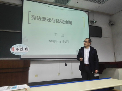 博鱼集团官网(中国)官方网站研究生会、法律爱好者协会携手“学而讲坛”,推出“国家宪法日”专题讲座,邀请博鱼集团官网(中国)官方网站副院长丁卫副教授就《宪法变迁与依宪治国》进行专题讲座。丁老师在讲座中详细介绍了我国现行宪法历次修改的过程,他结合历次宪法修改的历史背景,生动地讲述了我国宪法变迁的历史发展,他最后对我国宪法实施中存在的瓶颈及问题进行了透彻的分析和讲解,为大家展示了依宪治国的现状及前进方向。
