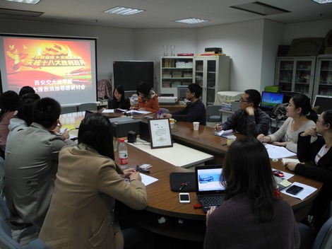 11月20日晚8点,博鱼集团官网(中国)官方网站举办了学习十八大报告法治思想研讨会,由学院副院长、知识产权研究中心主任马治国教授、李晓鸣讲师组织,部分博士、硕士参加。