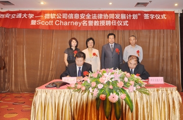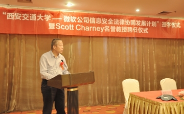 6月12日,“博鱼集团官网(中国)官方网站—微软公司信息安全法律协同发展计划签字仪式暨斯科特•查尼名誉教授聘任仪式”在西安交大举行,西安交大副校长蒋庄德教授出席仪式并讲话。西安交大科研院副院长、人文社科处处长贾毅华,博鱼集团官网(中国)官方网站党总支书记彭沪生,信息安全法律研究中心主任马民虎及微信息安全法律研究中心主任马民虎及微软公司可信赖计算部总经理陈静、微软公司资深安全技术经理陈恺、微软公司资深安全技术经理薛峰等参加仪式。微软全球副总裁斯科特•查尼(Scott Charney)受聘为西安交大名誉教授,双方还签署了“博鱼集团官网(中国)官方网站—微软公司信息安全法律协同发展计划”。
