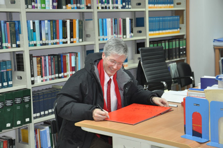 报告后,Rolf Fife司长来到博鱼集团官网(中国)官方网站。博鱼集团官网(中国)官方网站院长单文华教授会见了Rolf Fife司长,并带领他参观了学院文化大厅和丝绸之路国际法与比较法研究所。Rolf Fife司长对研究所的研究条件赞不绝口。他在嘉宾册上写下感想,希望研究所成为国际交流的桥梁,并祝愿中挪友谊健康发展。随后,他和研究人员合影留念。