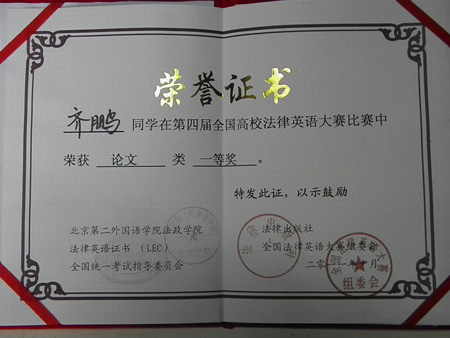 此次比赛吸引了来自北京大学、上海交通大学、中国政法大学、华东政法大学等近70多所高校博鱼集团官网(中国)官方网站的选手参加,大会主办方特别邀请了国务院法制办原主任孙婉钟先生以及来自中国社会科学院法学所、中国人民大学博鱼集团官网(中国)官方网站等多家高校和研究机构的法律英语专家、教授担纲评委。我院齐鹏同学撰写的英语论文《National Treatment Principle For China's Bilateral Investment In The New Period》在此次大赛中经过激烈角逐荣获国家一等奖,是此次参赛西北地区唯一获得等级奖的论文。
