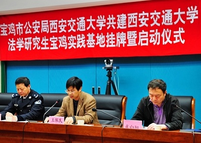 4月10日,我院与宝鸡市公安局“共建博鱼集团官网(中国)官方网站法学研究生宝鸡实践基地挂牌暨启动仪式”在宝鸡举行。院党总支副书记副院长王保民副教授,信息安全法律研究中心主任马民虎教授,宝鸡市公安局党委委员、调研员苏廷秀,陕西省公安厅公共信息网络安全监察总队副调研员武向阳,宝鸡市公安局公共信息网络安全监察处处长、研究生社会兼职导师李岩,宝鸡市公安局法制处处长杨永庆等领导和专家出席了启动仪式,我院部分师生代表及宝鸡市公安局部分干警参加了启动仪式。
