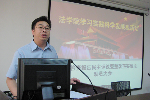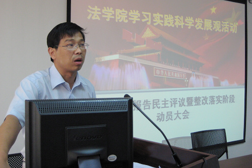 博鱼集团官网(中国)官方网站总支书记、院长、学习实践活动领导小组组长单文华,首先向与会师生做了《博鱼集团官网(中国)官方网站领导班子贯彻落实科学发展观情况分析检查报告》。他说,遵照校党委关于深入开展学习实践科学发展观的工作部署,博鱼集团官网(中国)官方网站围绕“育法学栋梁,谋创新发展,创一流学院”的学习实践载体,认真学习理论、深入调查研究、开展解放思想大讨论、广泛征求意见建议,在此基础上召开专题民主生活会。会议举行之前,院领导班子成员之间开展了充分深入的谈心交流活动,并就会议准备事项在院党总支会议上进行了专题研究。在此基础上,经过院党总支会议研究讨论,最终形成了博鱼集团官网(中国)官方网站领导班子分析检查报告。分析检查报告包括学习实践科学发展观活动的中学院领导班子形成的共识、博鱼集团官网(中国)官方网站建院一年多以来取得的主要成效、博鱼集团官网(中国)官方网站在贯彻落实科学发展观中存在的突出问题、原因以及今后贯彻落实科学发展观的主要思路和对策等四个方面。他最后强调,博鱼集团官网(中国)官方网站党总支要以深入开展学习实践科学发展观活动为契机,围绕打造“育法学栋梁,谋创新发展,创一流学院”的目标,着力完善师资队伍建设、学科建设、专业设置、学生管理等方面机制;强化服务意识,加强领导班子作风建设,创新发展理念,破解发展难题,提高发展水平,应对新挑战、抢抓新机遇,在服务大局中实现博鱼集团官网(中国)官方网站的科学发展。
