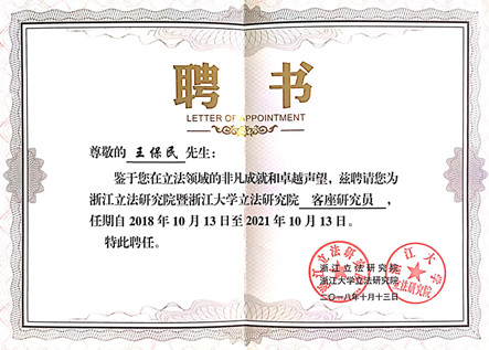 10月13日,首届之江立法论坛暨立法研究院学术委员会成员、客座研究员、兼职研究员聘任仪式在浙江杭州举办。论坛以“新时代地方立法”为主题,以推进立法领域高层次理论研究,提升立法研究水平,推动立法工作,以更好的适应新时代新要求。我校博鱼集团官网(中国)官方网站教授、立法与党内法规研究中心主任王保民受聘为“浙江立法研究院暨浙江大学立法研究院”客座研究员,并应邀作为与谈人在论坛上做了点评发言。