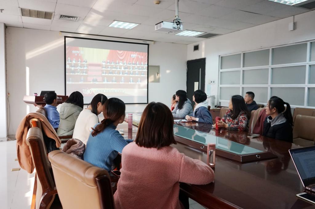 2018年12月18日上午,中共中央、国务院召开大会,隆重庆祝改革开放40周年。博鱼集团官网(中国)官方网站党总支组织教师党员、学生党员干部在主E-910会议室集中观看大会直播,认真聆听习近平总书记在大会上的重要讲话。