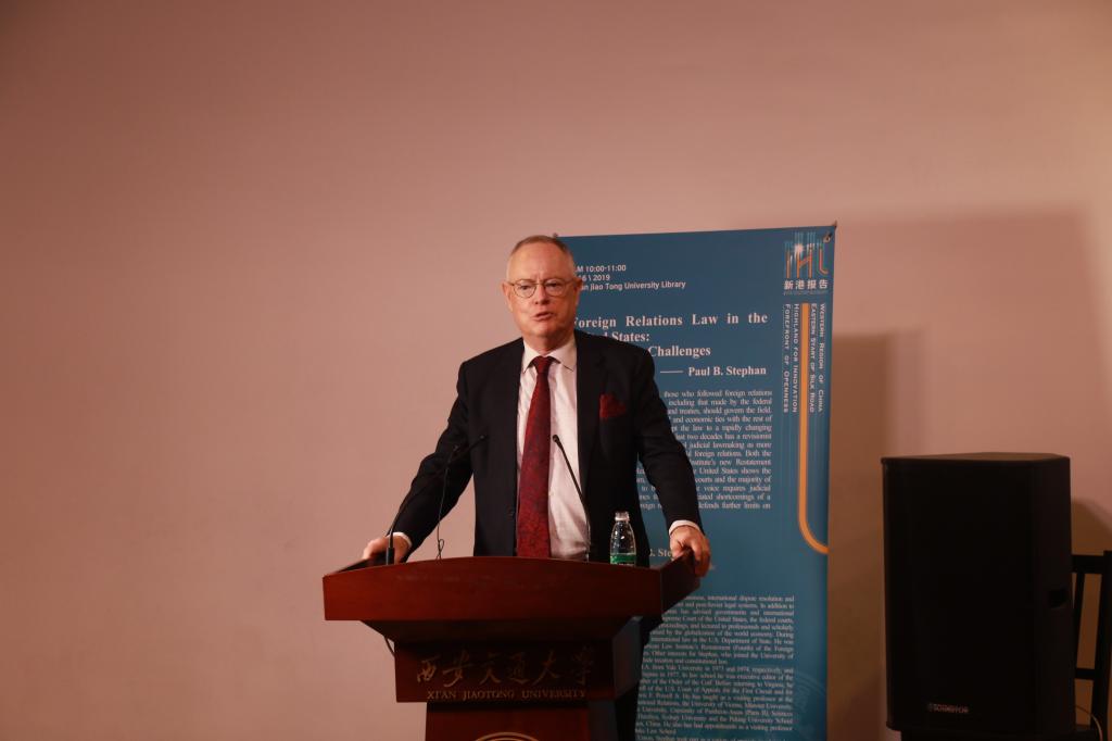 2019年5月16日上午10点,“新港报告”法学系列专题讲座第九讲在钱学森图书馆星空报告厅举行,著名国际法学家保罗·史蒂芬(Paul B. Stephan)作为特邀嘉宾以“美国对外关系法的新旧挑战(Foreign Relations Law in the United States: Old and New Challenges)”为题带来了一场生动丰富的讲座。本次报告由博鱼集团官网(中国)官方网站院长单文华教授主持。