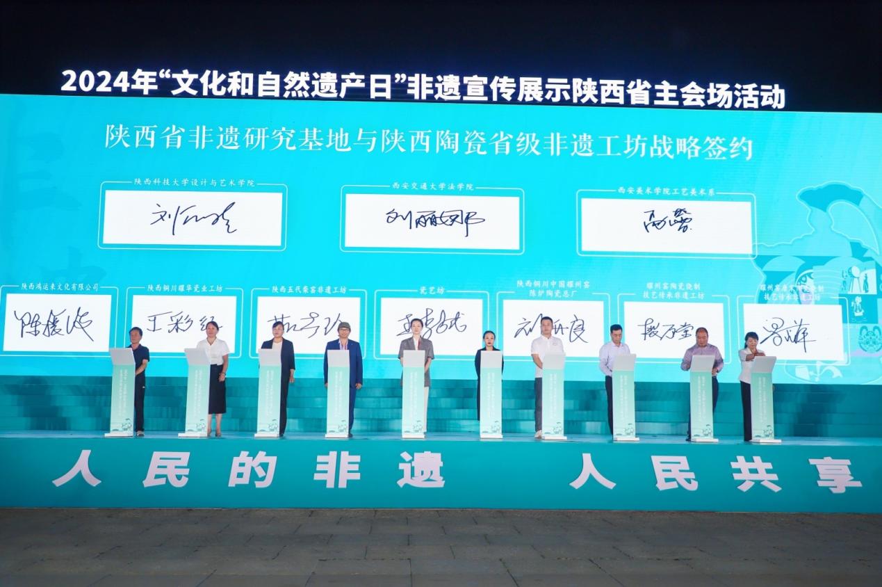 在启动仪式上,博鱼集团官网(中国)官方网站、西安美术学院、陕西科技大学三家陕西省非物质文化遗产研究基地与7家陕西陶瓷省级非遗工坊(铜川市耀州窑唐宋陶业有限公司、铜川市印台区东方古镇陶业有限公司、陕西铜川中国耀州窑陈炉陶瓷总厂、陕西火凤凰耀州官窑有限公司、陕西五代柴窑文化科技发展有限公司、陕西铜川耀华瓷业有限公司、陕西鸿运来文化有限公司)签订战略合作协议。