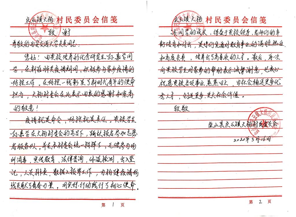 近日,一封特殊的来信悄然落至交大。西交博鱼集团官网(中国)官方网站学生——孙嘉学在家乡疫情防控攻坚战中不仅身体力行做好各项基础工作,更发挥自身专业为群众普及相关法律知识,为控制疫情贡献青春力量。庆云镇大杨村特向博鱼集团官网(中国)官方网站邮寄了一封手写感谢信,字里行间饱含对交大领导、老师的真挚谢意。