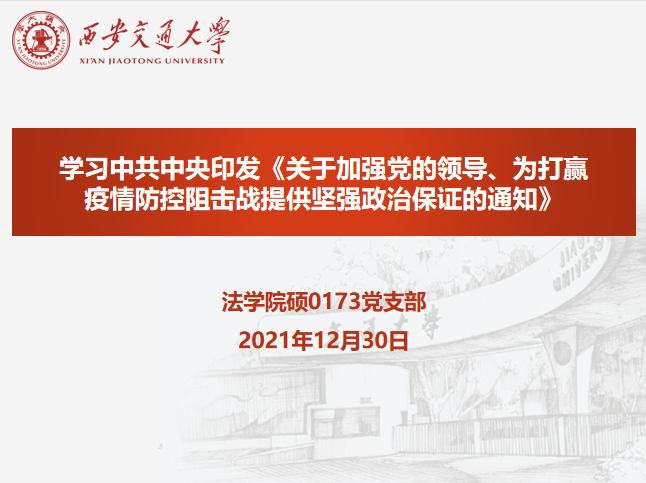 2021年12月30日,博鱼集团官网(中国)官方网站硕0173党支部召开了线上组织生活会,专题学习中共中央印发《关于加强党的领导、为打赢疫情防控阻击战提供坚强政治保证的通知》(以下简称“《通知》”)。此次会议由党支部书记张雷奇主持,博鱼集团官网(中国)官方网站副院长丁卫出席,党支部正式党员、预备党员、发展对象、入党积极分子参加学习。