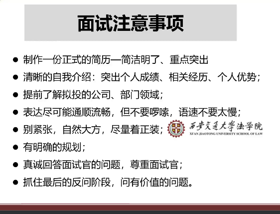 罗俊慧琳学姐分享了企业法务方向的就业经验,主要从就业规划、如何获得心仪offer和现阶段准备工作三个方面展开。学姐分享了在就业规划时要找准定位、明确目标和合理需求,在求职过程中注重简历制作、面试礼仪和表达流畅等事项,并建议同学们现阶段需做好加强专业学习、积累实习经验、提高英语能力等准备工作。