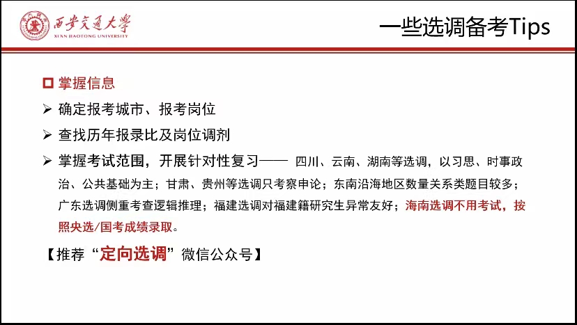 尹洁学姐分享了公务员、选调生方面的备考经验。首先,学姐简要了介绍了个人的基本信息,并分享了自己为何选择当一名选调生的原因;其次,学姐结合个人备考经历为同学们提供了一些选调备考的实用建议,一是要掌握信息,确定报考城市和查找岗位报录比、二是要把握考试范围,开展针对性复习、三是有效刷题,找到自己的优势项目。
